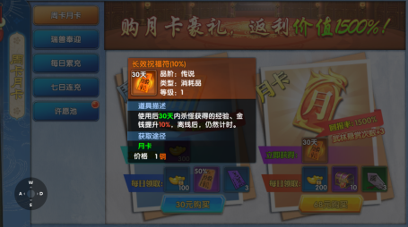 经验符加成算是临时Buff,月卡会送1个月的长效经验符,周卡每日领取时效1小时的符箓,但经验加成更高,50%加成,七日累充和每日累充也有送,想要获取更多经验符直接“珍宝阁”购买就行;后期解锁了精力值就吃精力丹。